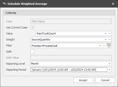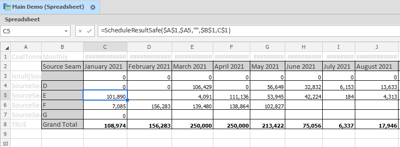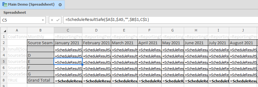 User Note: Generally, after selecting your Reporting Period in the menu above and populating the cell, you would return and change the Reporting Period reference to a Date Cell. e.g. =ScheduleSum("SourceQuantity", "Process=ProcessCoal", "Month", DATEVALUE("1/10/2013")) changes to =ScheduleSum("SourceQuantity", "Process=ProcessCoal", "Month", B$1).