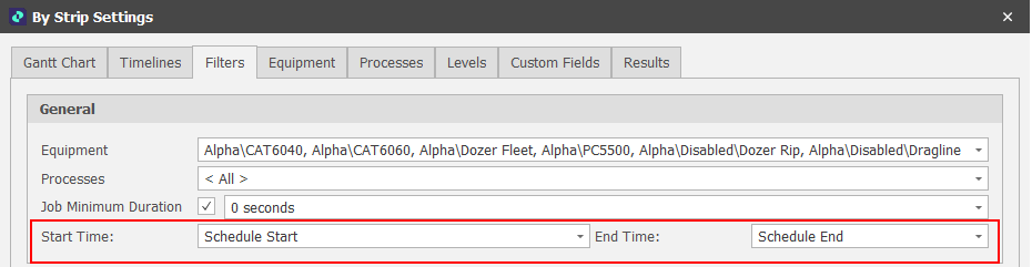 On the Filters tab of the Gantt Settings window, you can now filter by a specified Start Time (defaults to Schedule Start) and End Time (defaults to Schedule End).