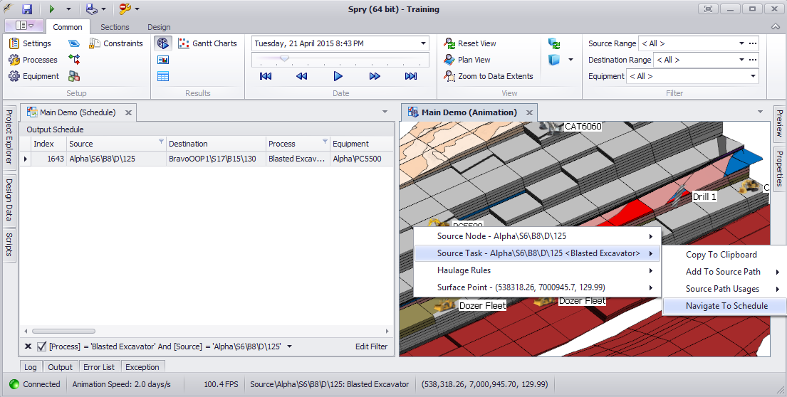 When Source Scheduling and/or Destination Scheduling simulations are enabled as part of your Scenario Settings, the Animation Window provides a simulation of the schedule task list from the Start date to the End date of your Scenario. When Haulage Simulation is enabled, an additional Haulage Networks node allows a network to be created as the basis for Haulage simulation.