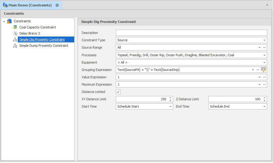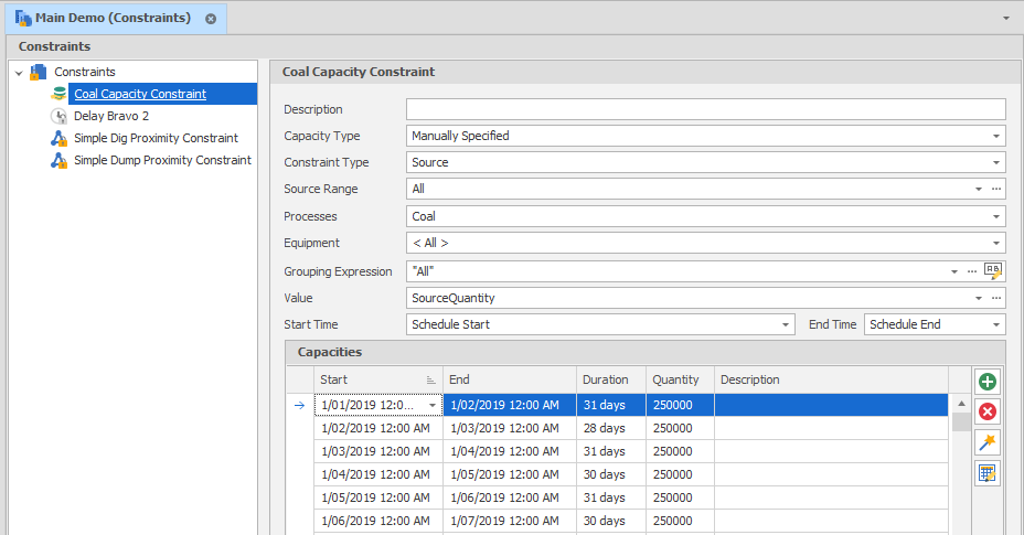 Capacity | Applies a limit to any value over a certain period of time. For example, if you didn't want to exceed more than 50,000t of Coal per month, or needed to limit the amount of waste heading to a certain dump every day you could apply a Capacity Constraint. It can be based off of your Calendar Table, or manually entered at whatever time frame suits your scheduling. |