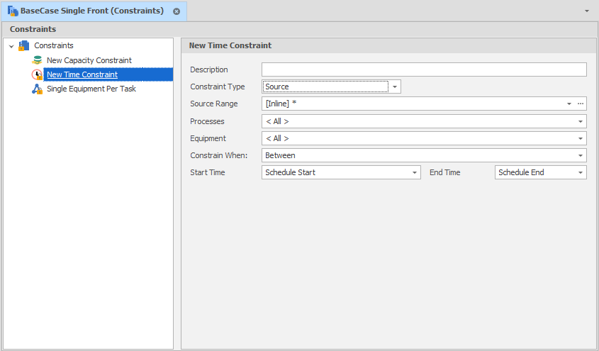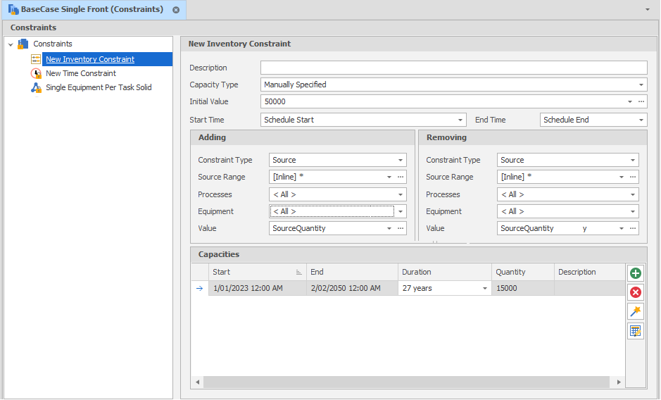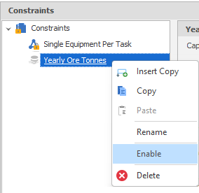 To add a Capacity Constraint right-click on "Constraints" and select Add - > New Capacity Constraint. ![]()