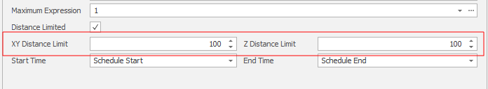 Distance Limited: Additional inputs are enabled when you choose to make the Proximity constraint distance limited by XY and/or Z distance.
