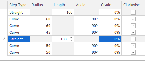 In the Steps grid, modify the parameters of a step by selecting a grid row. The Straight line segment or Curve you have selected is highlighted in the Design Window. Any changes you make to the settings of the Straight line segment or Curve are immediately reflected in the design.