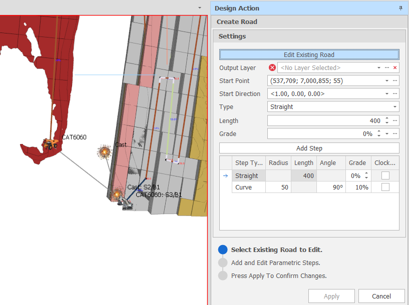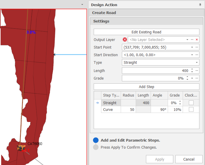 You can add and edit the parametric steps of an existing road or add and edit parametric steps to create a road from scratch.