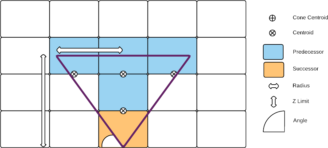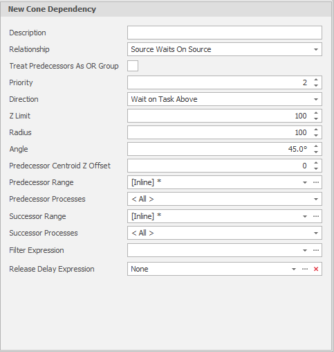 Cone Dependencies create Dependencies based on the Direction and Angle between Process Centroids. Z Limit and Radius constrain the resulting Cone for performance. A rough guide for the fastest application of this (no excess Dependencies created) is that the radius should be a little larger than your Block or Strip width and the Z level should be about Radius/tan(Angle). If unsure you can always make the numbers a little larger.