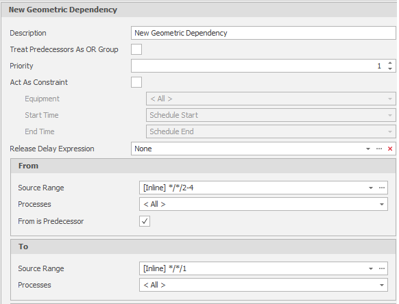Once a Predecessor Range has been completed, the Release Delay controls how long until the Successor Range is considered "Released" and can be worked. Accept the default (None) or build a Release Delay Expression using the operators, constants and functions provided by the Expression Editor.