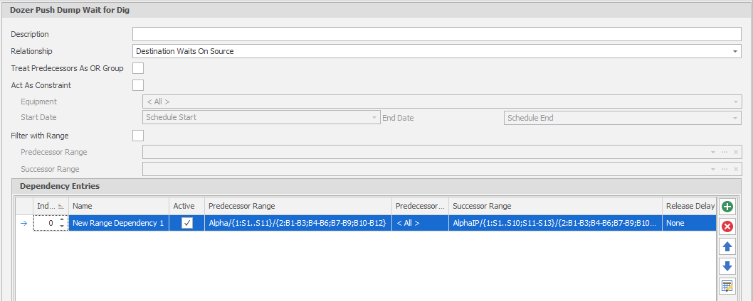 A Range Dependency is used to set dependencies between ranges of tasks by explicitly defining Predecessor and Successor pairs. Range dependencies are commonly used to group blocks together to form a single shot together, limit mining in an area until access is established, ensure cast and dozer material isn't blasted until the coal in the previous strip is mined or in situations where anomalies need to be controlled.