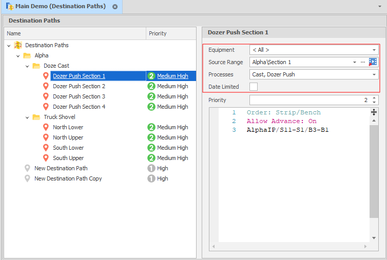 In a truck shovel operation, you may have 20 excavators, but the location of the ideal Destination is dependent on the location of the Source rather than the location of each individual excavator. In this example, you would have Destination Paths for different dump sites filtered by Range rather than by Equipment.