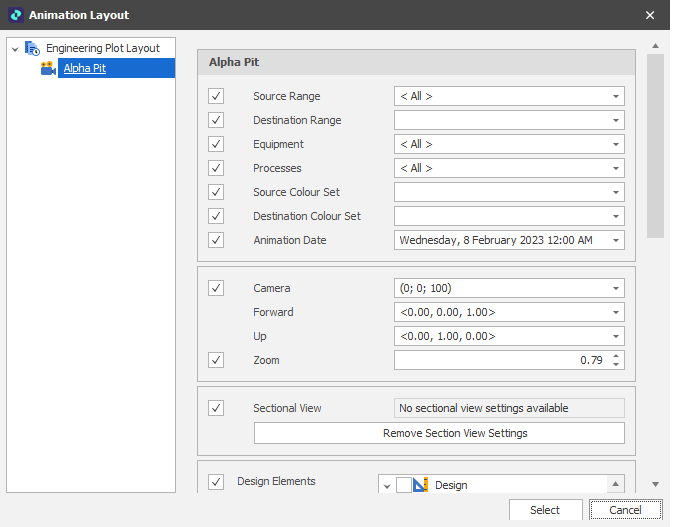 When you filter by Equipment/Processes (on the Home tab, in the Filter group) when the Animation View is open, the filters you apply are saved as part of the Animation Layout. You can apply the same or different Equipment and Process filters to your Plot Layout.