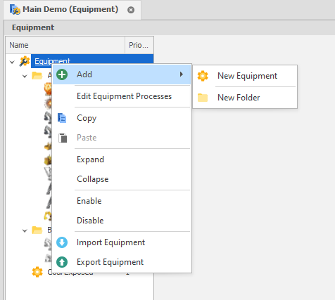 To add a piece of equipment, right click on Equipment in the side menu and select Add > New Equipment: