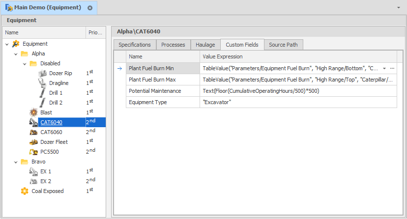 A Custom Field is a user-defined custom result that is built with a formula in the Expression Editor. The Custom Fields tab of the Equipment Settings window is available when one or more Per Equipment Custom Field Expressions have been setup in the Custom Fields setup step, allowing the same expressions to be reviewed and edited here.