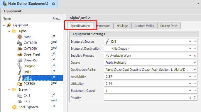 On the Specifications tab of the Equipment Settings window, choose how equipment is displayed and set applicable rates.