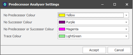 The colours that each of these options use can be modified by selecting Colour Selection from the Predecessor Analyser drop-down menu or via AllAll Settings: