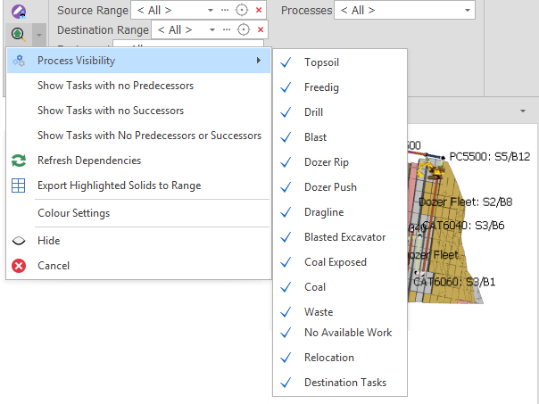 Use the Process Visibility menu to reduce noise or visual clutter by only showing stope or development processes, for example, when clicking on a stope solid, only show its drill task predecessors: