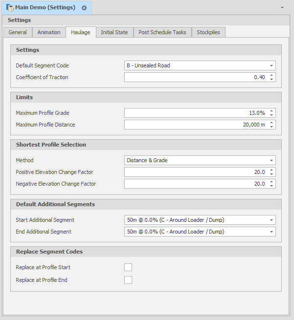 Default Grade and Distance limits defined here are applied when a haul profile is created. These may be overridden when Maximum Grade and Distance values are set for Network (Attach and Detach) Rules.
