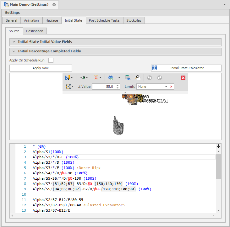 Initial State allows you to set a pre-mined or pre-scheduled state using the same text range style as Source and Destination Paths. You can use the Initial State tool to keep your scenarios up-to-date based on face positions in the real world.