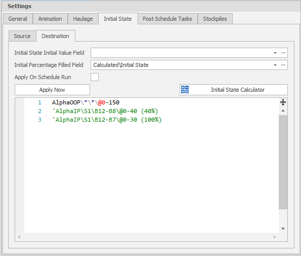 In order for an Initial State to be effective, it references and writes to a relevant Percentage Field which is set via the Destination Initial Percentage Filled Field in Scenario Settings > General.