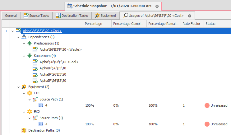 The Usages tab allows you to see current Dependencies, Equipment that will be available to work the Task, and any relevant Destination Paths.