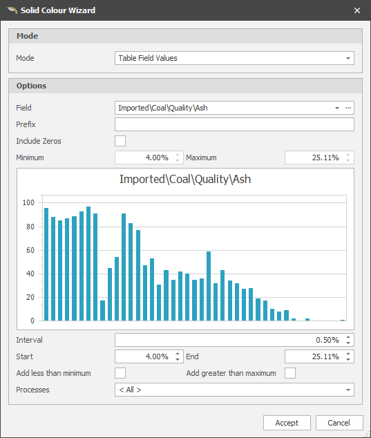 Optionally specify a Start and End value. These will default to the Minimum and Maximum field values you have specified.