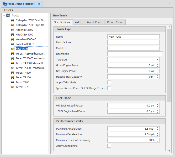 Micromine Spry has a truck database which includes over 100 common mining truck/engine combinations. If you wish to enter your own data, it is important to note that scales and units on rimpull and retard charts range from linear to logarithmic and can use kg force, kN or lb force.