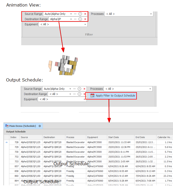 On the Home tab or the Design tab, in the Filter group, when you filter the Animation by Source/Destination Range, Equipment and/or Processes, you can now click an Apply Filter to Output Schedule button to apply the same filter to the Output Schedule.