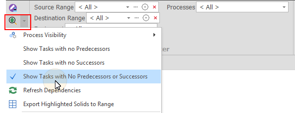 On the Design tab, in the Action group, you can now select Predecessor Analysis to visualise your dependencies and highlight potential errors, for example, tasks without predecessors or successors: