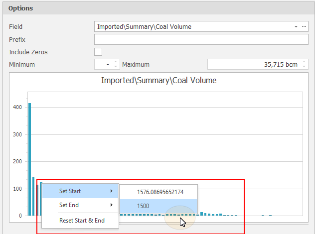On the Home tab, in the View group, when you select Solid Colours to apply a colour set to the Source and/or Destination solids currently displayed in the Animation window, when you select Table Field Values as the Mode in the Colour Set Wizard, you can now right-click on the bar chart to set values for the Start and End spin edits (or Reset the Start and End to the Minimum and Maximum):