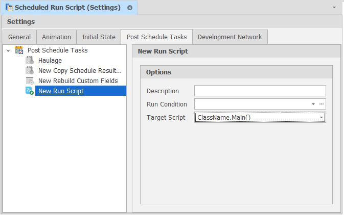 In the Scenario Settings window, on the Post Schedule Tasks tab, two new tasks can now be added: