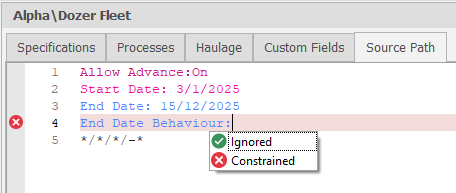 The Source Path syntax has been extended to allow a Start Date and an End Date to be set for a set of tasks. An End Date Behaviour flag can also be set which allows two states: