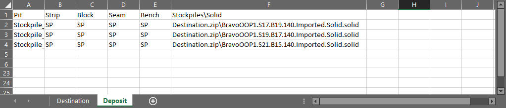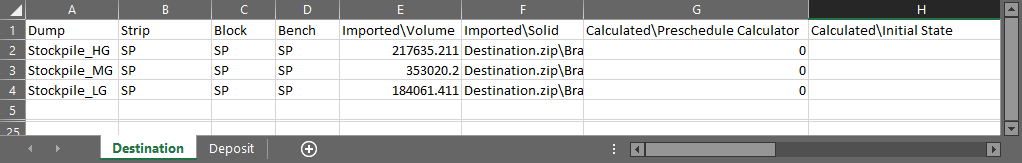 In the example below, the exported records from the Destination table have had all data stripped except their solid which has been remapped to the Stockpiles\Solid field created in the previous step.