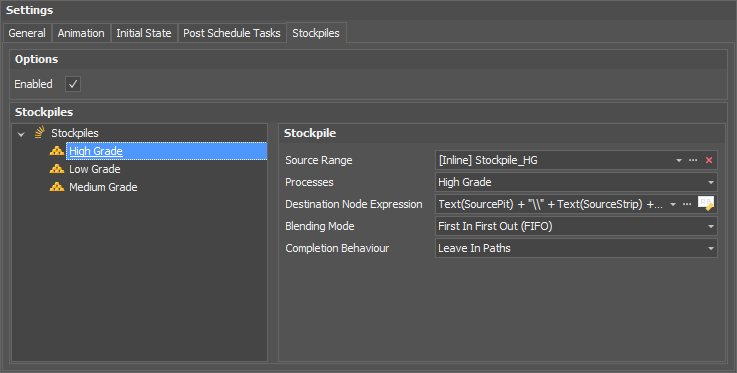 Completion behaviour refers to how the application treats stockpile tasks. A completed stockpile task is any schedule step in which a piece of equipment works a process from the stockpile. Importantly, a completed task does not necessarily mean that the equipment has worked all the material.