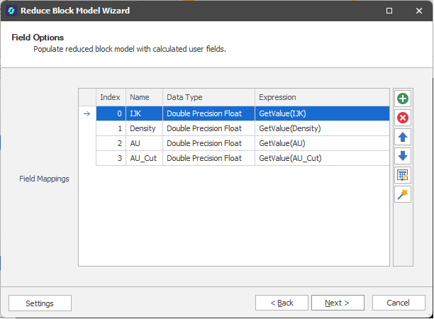 Use the Field Options page of the Reduce Block Model Wizard to populate the reduced block model with user-defined calculated fields.