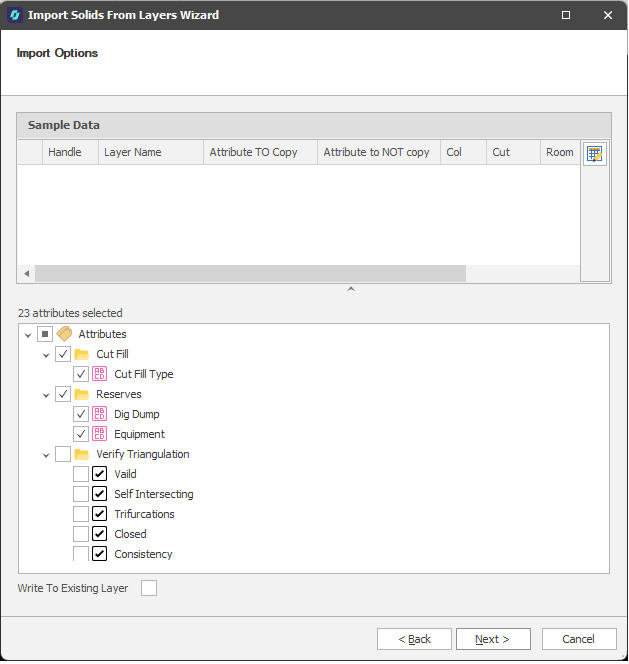 Note: For third-party file imports, the contents of the file you have selected for import are shown in the Sample Data pane for review. This may not be applicable when importing Micromine Spry layers.
