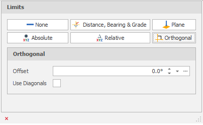 In Orthogonal mode, lines can be drawn at angles {0°,90°,180°,270°} with a specified offset. If the specified offset is 12°, then lines will be drawn at {12°, 102°, 192°, 282°}, allowing straight lines to be drawn even if the model is at a slight bias to true north.