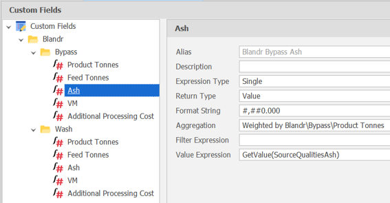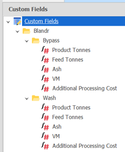All of these Custom Fields will need to refer to the correct data in their expressions and have a suitable Aggregation set (Sum for Product Tonnes and Weight Average for qualities, is normal).