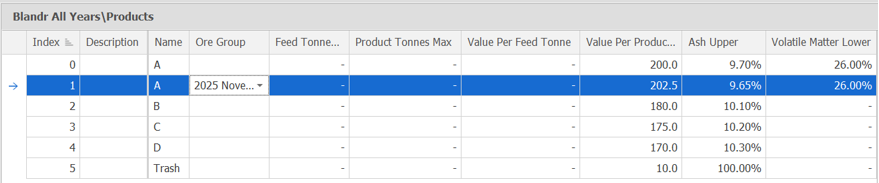 The Ore Group Field is the field on the table that will be used to group all of the records together. It is not common to want to blend the entire table together in the most profitable way. It is much more common to want to blend each month in that month's most profitable way or each year, fortnight, etc. If the importer was used to populate the table, then this field will already represent the Reporting Period from the selected Reporting Level.