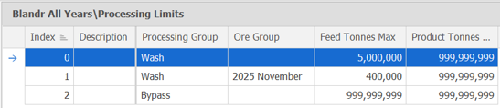 This is where limits are placed on how much volume can be fed or produced by any of the processing methods. In a similar fashion, these can be delegated specifically for certain Ore Groups or left blank to encompass every ore group.
